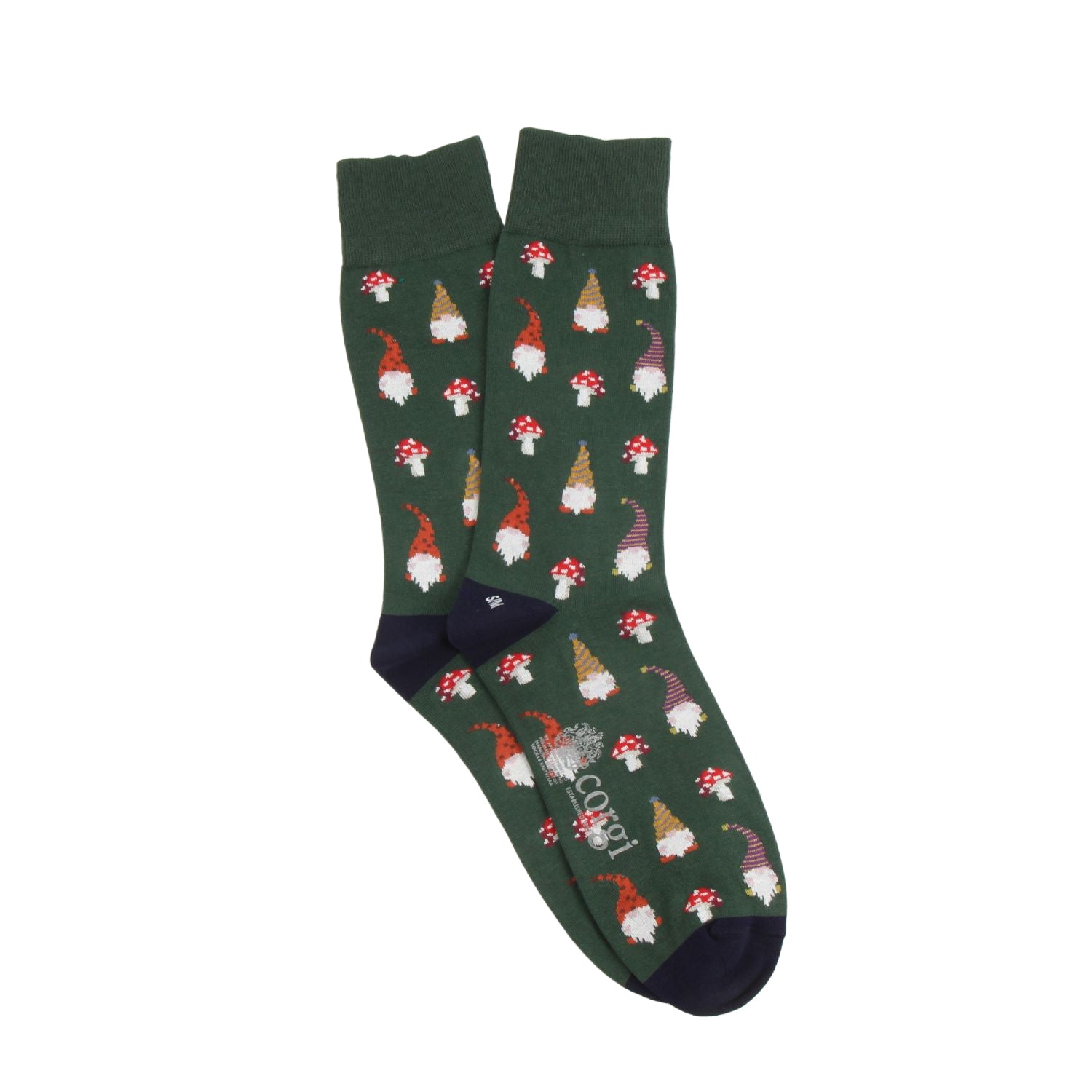 Our Men’s Festive Gonk Cotton Socks feature a cheerful all-over design of colourful gonks and toadstools set against a rich forest green background, finished with smart navy heels and toes. Knitted from a soft, breathable cotton blend, they offer all-day comfort with a dash of Christmas character.