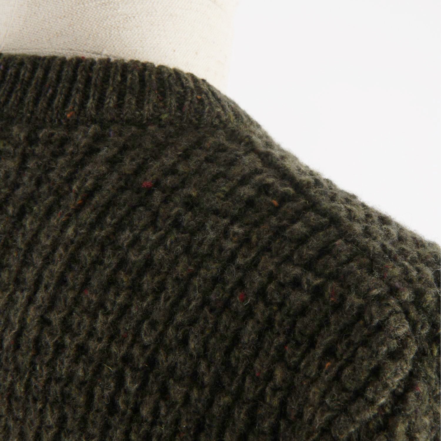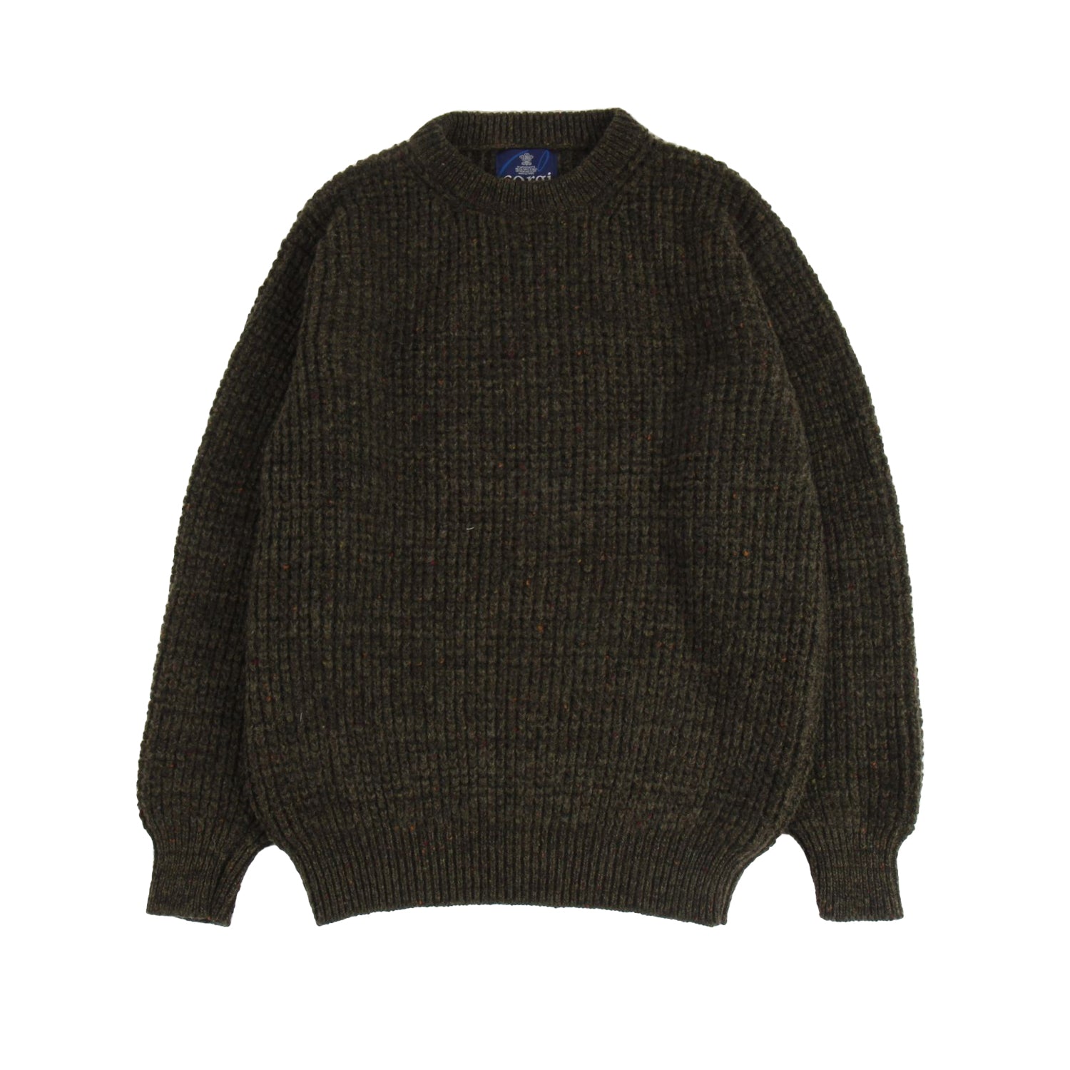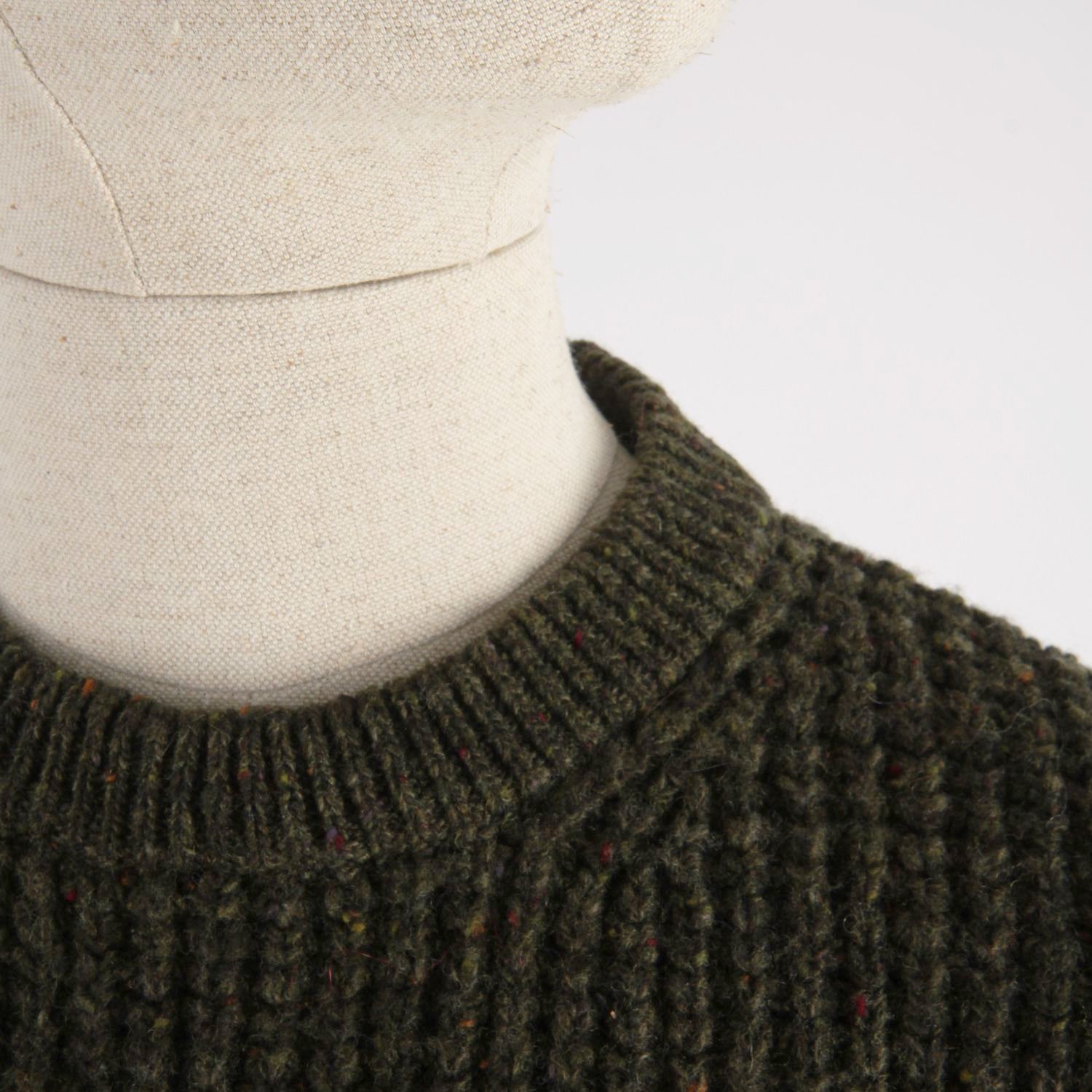 This rustic tweed sweater features a textured 'waffle stitch' is in finished with ribbed cuffs, and hem in a 1x1 rib. With a modern fit in a classic style, the 5-gauge Donegal wool fabric offers a mid-weight feel, perfect for layering during transitional seasons.