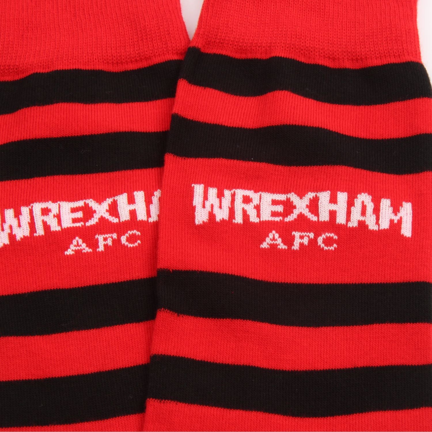 Step into heritage style with these lightweight cotton socks, inspired by Wrexham AFC’s classic vintage kit. Featuring bold red and black hoops, the design pays tribute to the club’s history while offering a modern, comfortable fit. Knitted from a soft, breathable cotton blend, these socks are perfect for everyday wear, keeping your feet cool and comfortable throughout the day. Finished with the official Wrexham AFC logo, they combine club pride with timeless style—ideal for both match days and casual wear.